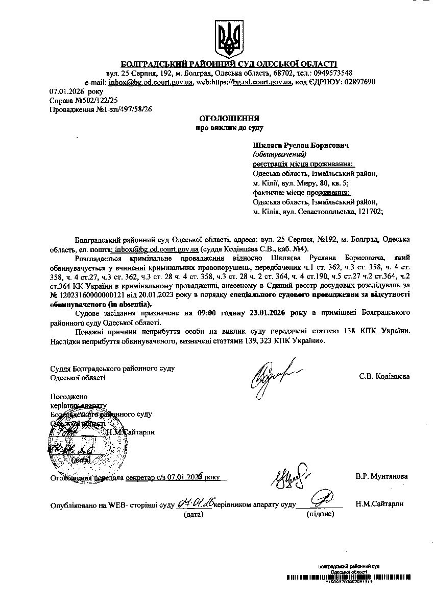 Оголошення про виклик Шкляєва Р.Б.