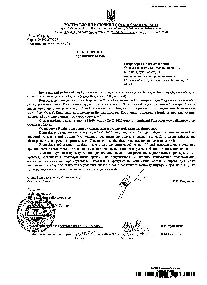 Оголошення про виклик Островерхої Н.Ф.